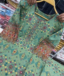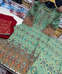 ♥বডির প্যানেল ও হাতায় টিস্যু কাপড়ে এমব্রয়ডারি কাজ করা, ফুল বডিতে বাড়ি স্টোন ও স্কিন প্রিন্ট করা 100%কালার গ্যারান্টি ।